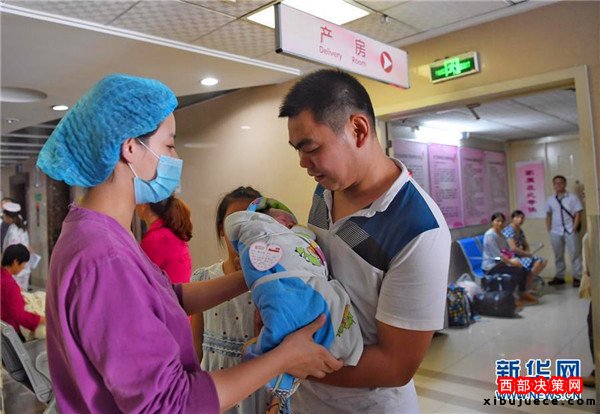 新橋醫(yī)院婦產(chǎn)科病房,剛出生的小寶寶與父親汪飛波(右)見面。