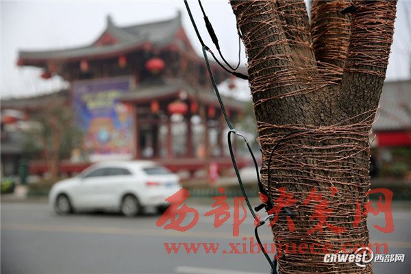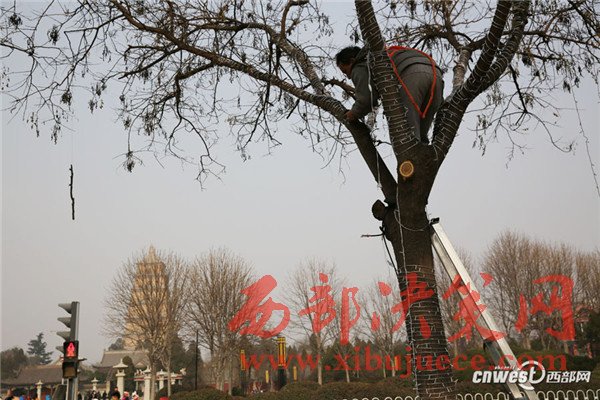 春節(jié)不遠(yuǎn) 工人爬樹綁彩燈點(diǎn)亮街頭樹