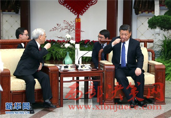 1月12日,中共中央總書記、國家主席習(xí)近平在北京人民大會堂同越共中央總書記阮富仲舉行會談。這是會談后,兩黨總書記進(jìn)行茶敘。