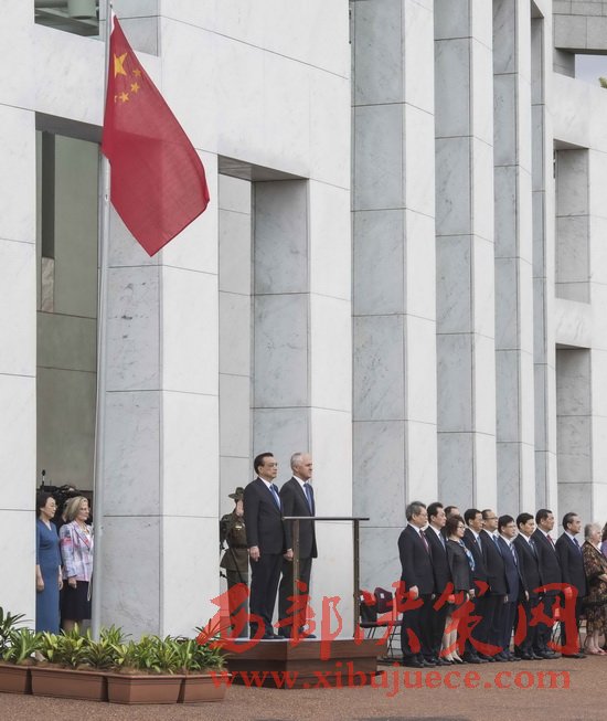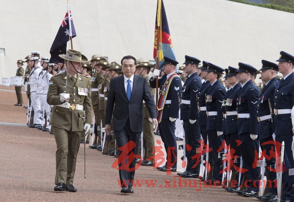 當?shù)貢r間23日上午,澳大利亞總理特恩布爾在堪培拉議會大廈廣場舉行隆重儀式,歡迎李克強總理對澳進行正式訪問。19響禮炮聲中,特恩布爾夫婦在下車處迎接李克強夫婦。廣場上奏響中國國歌,李克強檢閱了儀仗隊。兩國總理登上檢閱臺后,軍樂團再次奏響中澳兩國國歌。