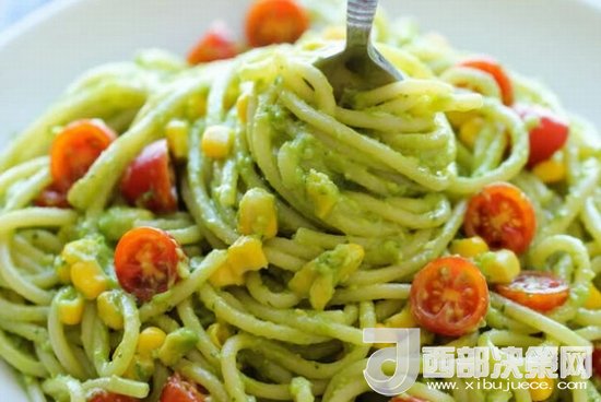 牛油果Pasta 將牛油果切塊,和檸檬汁、羅勒葉、大蒜一起放進(jìn)攪拌機(jī)打成泥狀,和煮好的Pasta一起攪拌,Pasta頓時(shí)也變身小清新。