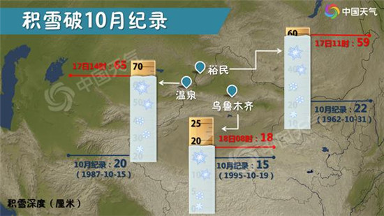 受強冷空氣影響,17日新疆伊犁河谷平原地區(qū)出現(xiàn)近28年以來最早大范圍初雪,首府烏魯木齊也降下今年下半年的初雪,較常年初雪日10月23日(1981-2010年)略早。昨天早晨降雪持續(xù),8時烏魯木齊積雪已經(jīng)達(dá)到18厘米,打破了當(dāng)?shù)?0月份的積雪紀(jì)錄,并且最低氣溫首度“破冰”只有-1℃。受其影響嗎,新疆暴雪、大風(fēng)、寒潮、霜凍、道路結(jié)冰、沙塵暴6個預(yù)警齊發(fā),惡劣天氣為農(nóng)牧業(yè)生產(chǎn)、林果業(yè)、交通旅游、城市運行等帶來了不利影響。
