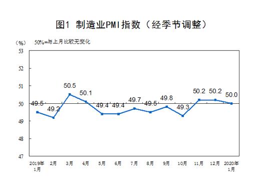 2020年1月份,中國(guó)制造業(yè)采購(gòu)經(jīng)理指數(shù)(PMI)為50.0%,比上月小幅回落0.2個(gè)百分點(diǎn)。