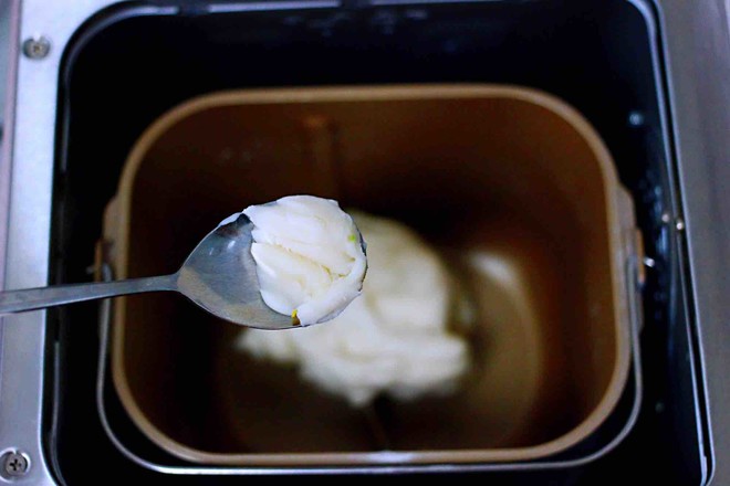 7.和好的面團(tuán)加入豬油,再次啟動面包機(jī)的和面程序進(jìn)行和面,加了豬油做的餅香酥軟脆喲。