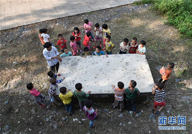 在廣西東蘭縣三石鎮(zhèn)泗爺小學(xué),黃英雄老師課間和學(xué)生一起打乒乓球(2014年9月10日攝)。新華社記者 陸波岸 攝