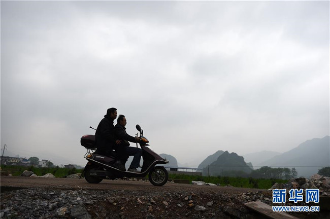 在廣西灌陽縣洞井瑤族鄉(xiāng),桂平巖小學(xué)老師趙仁斌(前)用電單車將楊大杰老師載去學(xué)校的路上(2016年3月24日攝)。2015年3月,楊大杰被診斷為股骨頭壞死,經(jīng)過一段時間治療病情有所緩解后,他堅持帶病回到教學(xué)崗位上。新華社記者 陸波岸 攝