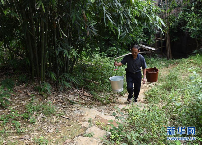 在廣西天等縣進結(jié)鎮(zhèn)愛樂村龍坡屯,龍坡教學(xué)點老師黃明料在教學(xué)點附近農(nóng)家挑水回學(xué)校給學(xué)生做午飯(2015年9月10日攝)。新華社記者 陸波岸 攝