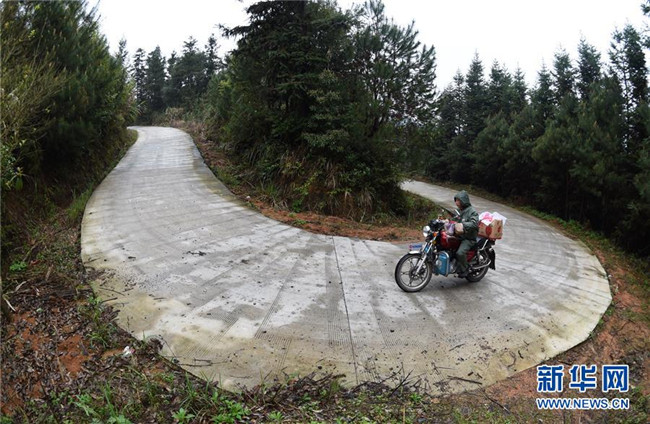 在廣西灌陽縣洞井瑤族鄉(xiāng),野豬殿村小學(xué)老師周運雄在采購學(xué)生營養(yǎng)餐食材后騎行在回學(xué)校的路上(2016年3月23日攝)。新華社記者 陸波岸 攝