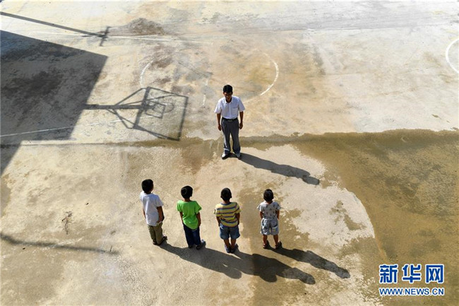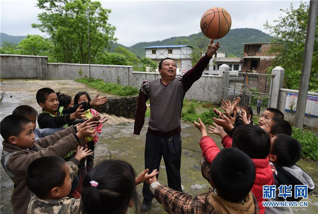 在廣西全州縣白寶鄉(xiāng)北山村小學(xué),唐廣芳老師在給學(xué)生上體育課(2016年4月26日攝)。新華社記者 陸波岸 攝