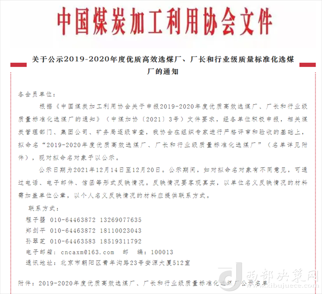 西部決策網(wǎng)訊12月14日,從中國(guó)煤炭加工利用協(xié)會(huì)傳來喜訊,陜煤集團(tuán)陜北礦業(yè)檸條塔公司選煤廠榮獲2019-2020年度行業(yè)級(jí)質(zhì)量標(biāo)準(zhǔn)化選煤廠。