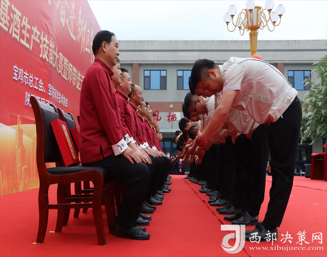 大賽儀式上,西鳳集團舉行了2022年師帶徒活動拜師儀式,32名新老基酒一線職工結成16對“師徒”對子。以徒弟敬“連心酒”,師傅贈送《西鳳酒文化瑰寶》,師徒共誦《弟子表》的形式完成了拜師禮,正式結為師徒。在今后的工作中這些師徒將共同奮戰(zhàn)在生產(chǎn)一線,師帶徒、徒幫師,將古老的制曲制酒工藝代代傳承。