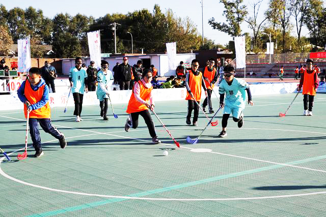 2021年10月17日,北京舉行中小學生旱地冰球比賽,圖為參賽學生在比賽中。新華社發(fā)(周良 攝)