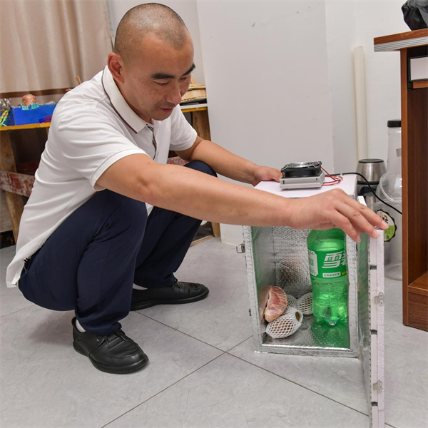 只有初中文憑的楊波就開(kāi)始學(xué)習(xí)冰箱知識(shí),了解冰箱原理結(jié)構(gòu):為什么會(huì)制冷還能調(diào)節(jié)溫度?等等,做到了了然于胸,又購(gòu)買(mǎi)了冷卻片、制冷片、散熱片、風(fēng)扇、溫度計(jì)、封條等必備用料,自己又在工地找到了廢棄的塑膠板,在家具店里找來(lái)隔熱錫紙,經(jīng)過(guò)一番折騰,一臺(tái)高60 厘米、寬40厘米、厚40厘米的手工小冰箱做成功了。使用2個(gè)月來(lái),最低溫度可達(dá)2攝氏度。效果非常好!