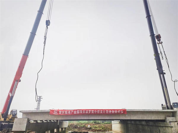 肇慶臨港產(chǎn)業(yè)園項目波羅竇中橋首片箱梁架設成功