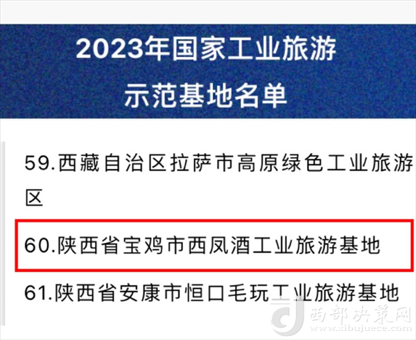 西部決策網訊(記者劉玉 韓宗憲 通訊員李秀麗 張雨萌)10月12日,從文化和旅游部傳來喜訊,西鳳股份公司榮獲“國家工業(yè)旅游示范基地”。