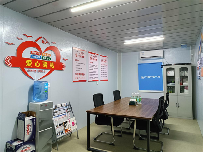 服務(wù)站門口即是S312省道,距離轉(zhuǎn)體梁主要施工工點(diǎn)不足500米,步行8到10分鐘可達(dá)。服務(wù)對(duì)象包括勞動(dòng)工人、環(huán)衛(wèi)綠化工人、市政維修工人等戶外勞動(dòng)者。站點(diǎn)內(nèi)溫暖明亮,空調(diào)和飲水機(jī)的冷熱水24小時(shí)提供便利,雨傘架、充電站解決燃眉之急。急救藥箱內(nèi)含有退燒貼和暖貼,感冒消炎、消毒止血常備藥以供不時(shí)之需,除此之外還增設(shè)特色閱讀區(qū),各類書籍、月刊、報(bào)紙可供勞動(dòng)者休息時(shí)閱讀放松,并由工作人員定期更新。