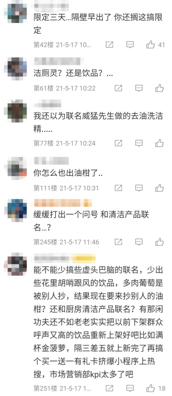 2021年5月,喜茶與清潔品牌威猛先生聯(lián)名推出油柑茶,其初衷本是借助威猛先生清潔去油的特質(zhì)突出聯(lián)名產(chǎn)品刮油解膩的特效,推出后卻被網(wǎng)友調(diào)侃道“這是潔廁靈還是飲品?” “緩緩打出一個問號”……除此之外,在喜茶推出此聯(lián)名之前,已有其他品牌推出了油柑茶產(chǎn)品,有網(wǎng)友對此評論“你怎么也出油柑了……”。