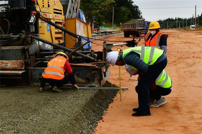 筆者在現(xiàn)場(chǎng)看到,運(yùn)輸車將水穩(wěn)料緩緩倒入攤鋪機(jī)料斗里,2名司機(jī)開著攤鋪機(jī)緩緩前行,現(xiàn)場(chǎng)管理人員和作業(yè)人員互相配合,不時(shí)測(cè)量著攤鋪厚度……攤鋪到了50米左右,壓路機(jī)開始進(jìn)行碾壓作業(yè)……