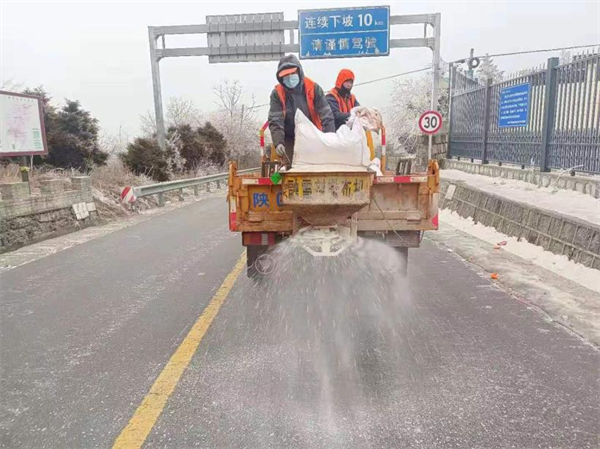 寧陜旬陽(yáng)壩至平河梁路段因凍雨結(jié)冰,安康市公路局寧陜公路段全力防滑保暢,組織開展除冰工作。(吳家?。?/div>