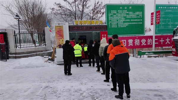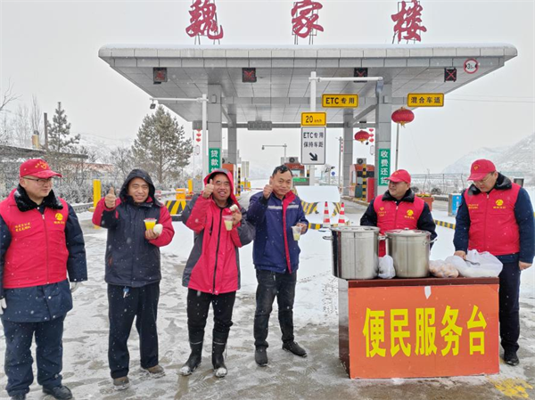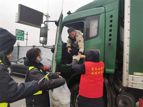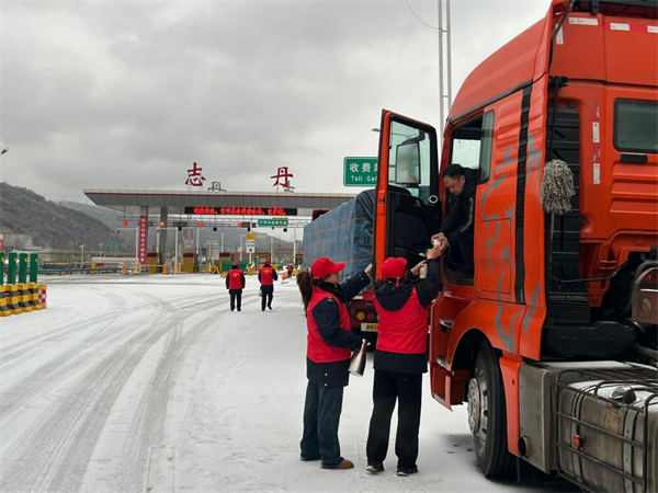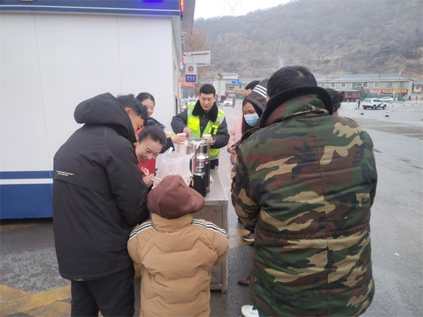 西富分公司轄區(qū)各收費(fèi)站志愿服務(wù)小分隊(duì)為滯留司乘提供熱水、飯菜等,并與司乘親切交談,耐心解答道路實(shí)時(shí)情況。(朱顏)