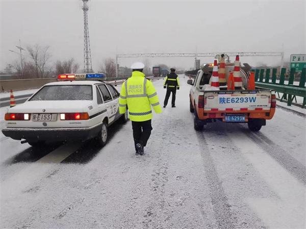 因凍雨、降雪惡劣天氣影響,自2月21日0時(shí)起,渭南市高速交警在G30連霍高速K905+800西安方向?qū)χ骶€進(jìn)行交通管制,入陜所有車輛分流至秦東收費(fèi)站下道。圖為西渭分公司華陰管理所安全路產(chǎn)中隊(duì)人員配合高速交警引導(dǎo)車輛分流。(邵曉斌)