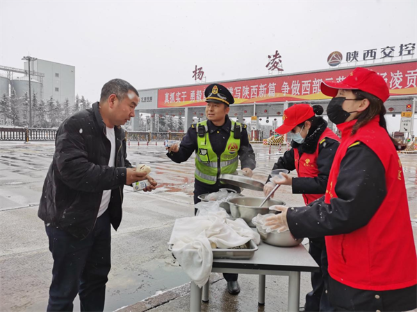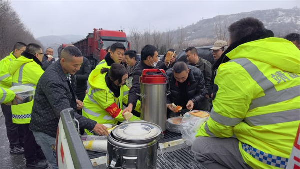 西略分公司所轄各站組織人員為司乘提供饅頭、雞蛋、豆奶、方便面、熱水等簡(jiǎn)餐,并對(duì)滯留車輛做好解釋工作,安撫司乘焦躁情緒,讓司乘在寒潮天氣里感受到陜西交控人的溫暖與關(guān)心。(西略分公司)