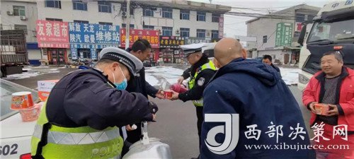 2月23日,潼關(guān)縣交警大隊(duì)秦東中隊(duì)中隊(duì)長(zhǎng)梁寬鋒組織中隊(duì)民警為滯留的司機(jī)師傅送去火腿腸、泡面、熱水等物資,給司機(jī)和乘客倒上熱水送溫暖,并叮囑他們耐心等待。