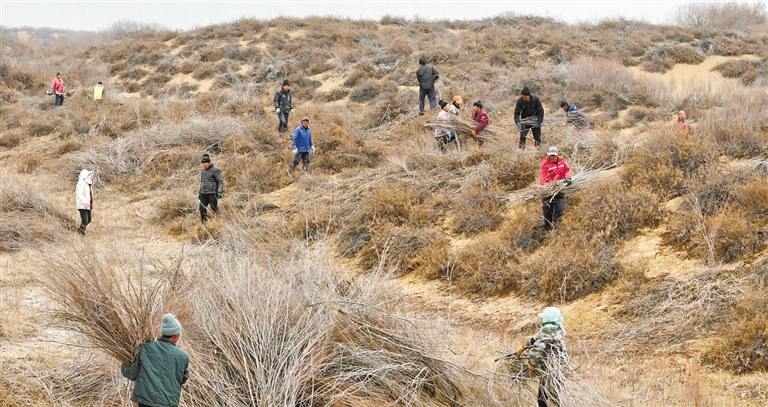 3月5日,在榆林市榆陽區(qū)小壕兔鄉(xiāng)掌高兔村,技術人員在進行沙柳平茬作業(yè)。